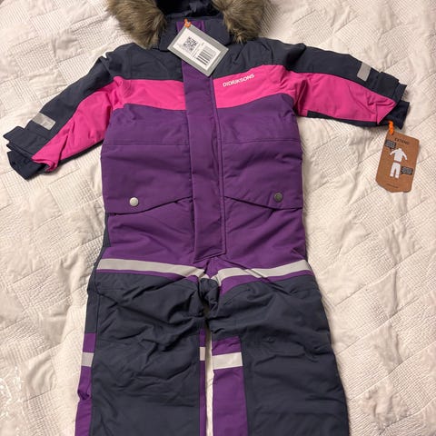 Didrikssonin waterproof-haalari. Jatkot avaamatta, vyötäröllä kiristys ja lahkeissä silikonit pitämässä paikallaan.