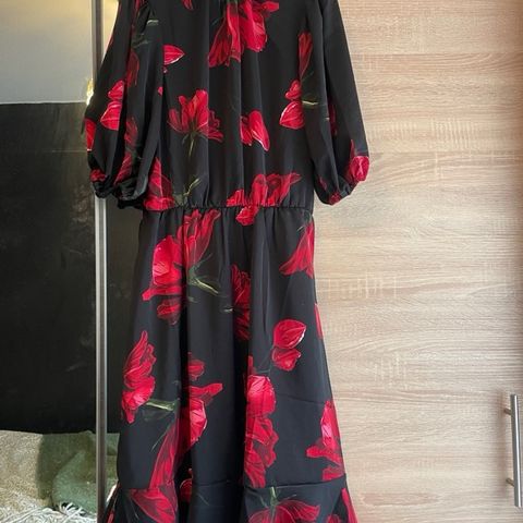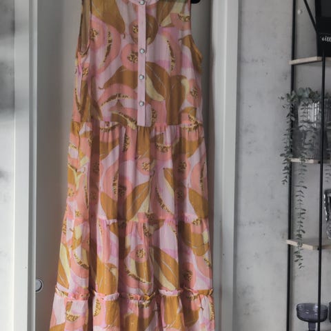 Kesäinen Numphin mekko koossa M. Tyköistuva. Tummalla pohjalla eri värisiä perhosia. Erinomainen kunto. Miedosti puhvihihat. Takana pitkä vetoketju