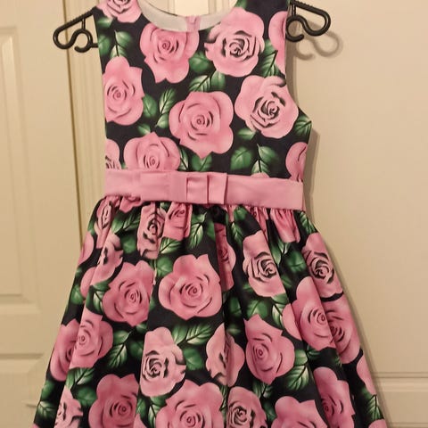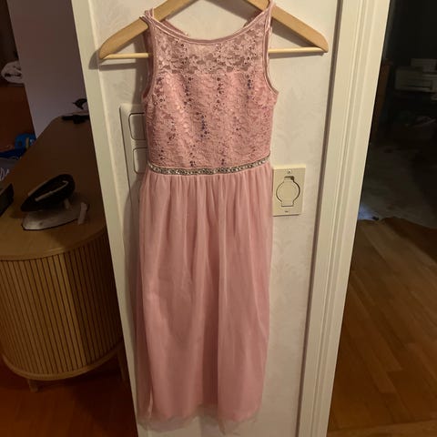 Kaunis satiininen muutaman kerran käytetty juhlamekko, joss helmassa kirjailuja, koko n. 134 cm. Sifonkihuivi mukaan.