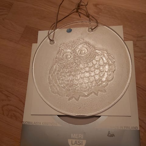 Halkaisija 25 cm. Kotimainen lasi pöllö koriste.