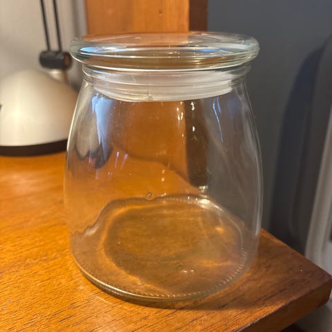 Lasitölkki metallikannella. Koko 9x9 cm, korkeus 9 cm. Metallinen, sisäpuolelta hiukan hapettunut kansi.
