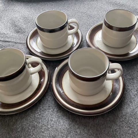 Myydään 2 kpl Arabian Karelia kahvikuppeja aluslautasineen. Hinta 3/kpl