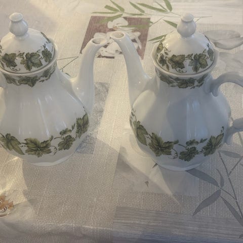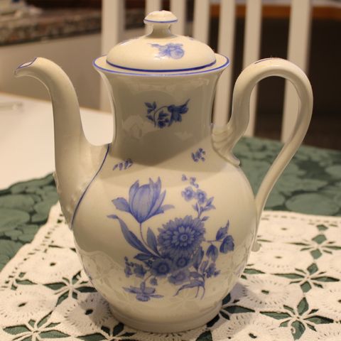Design Björn Wiinblad, 1980-luvulta. Myynnissä erinomaisessa kunnossa oleva kahvikannu. Ulkopinnassa on yksi hento naarmu lasitteessa, ks. viimeinen kuva. Kannun korkeus on 19 cm ja pohjan halkaisija 13 cm.
