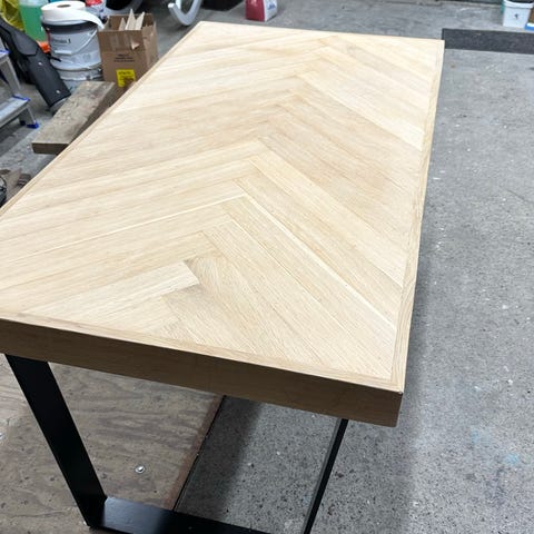 Sementtikuvioinen korkeapainelaminaatista mittatyönä valmistettu 210x100 kokoinen pöytälevy ja Savo Design mustat pöydänjalat.