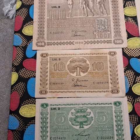 Setelit: 100mk 1976 , 10 mk 1980 ,5 mk 1963 1mk 1963 , ja 10 mk litt.B 1945, metallirahat: Kupari : 5 p 1911 , 1 mk 1943 , 50 p 1941 ja 1943 , 5 p 1976 , 1 p 1963 , messinki: 5mk 1980, 50 p 1985 , 20 p 1963 , 10 p 1980 , hopea : 1 mk 1964 , Rauta 1mk 1972, 1977 , 1mk 1938 , 50 p 1923 , 1937 , 25 p 1939 , käteinen ja nouto.