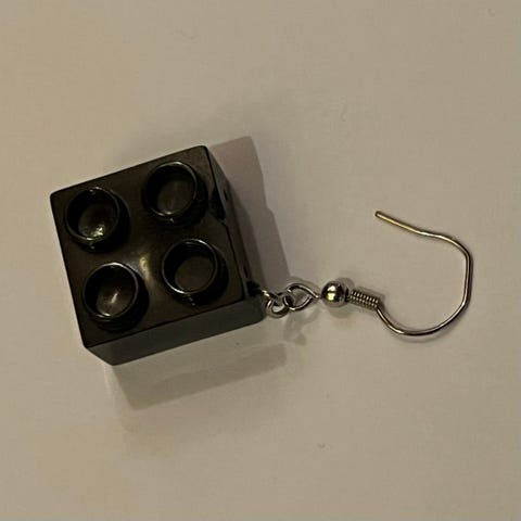 Itsetehdyt korvakorut Lego-lehdistä. Koukut kirurginterästä. Ei rasiaa.