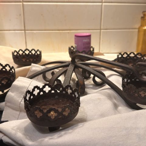Puualusta 20*45. Kantokahvassa nahkapunos. Kantokahvat, pulloteline ja kynttiläpidikkkeet metallia.