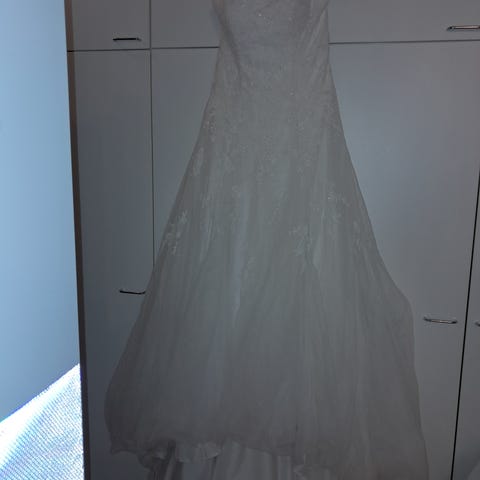 Pesetetty pesulassa, kunto erinomainen. Mukaan valkoinen hääpukupussi.