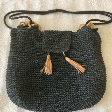 Laukun leveys noin 22cm, korkeus noin 25cm. Olkahihna noin 115cm (solmimalla helposti lyhennettävissä).