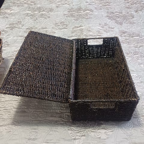 Tummanruskea punottu kori, jossa luonnonvalkoinen irroitettava sisäpussi. Leveys 54 cm, syvyys 39 cm ja korkeus 29 cm. Ollut käytössä vain sisätiloissa, siistissä kodissa.