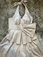 Catwalk hal terneck dress 40002819, Smokey Rose, Beessin värinen, kiiltävä pintainen Mekko, koko M, mekon alaosassa sisäpuolella tylliä ja alushame, sivussa vetoketju, leveä kuminauha rypytys yläosassa, solmittavat nauhat kaulan taakse, materiaali 65%puuvillaa, 30%polyesteria, 5%elastaania, mitta kainalosta kainaloon 38 cm edestä mitta(joustaa 47 cm, pituus kaula-aukossa helmaan 67 cm, siisti.