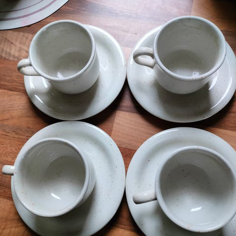 6 hengen, saksalaista posliinia, kultareunukset vain vähän kuluneet. 70-luvulta. Ehjiä ovat.