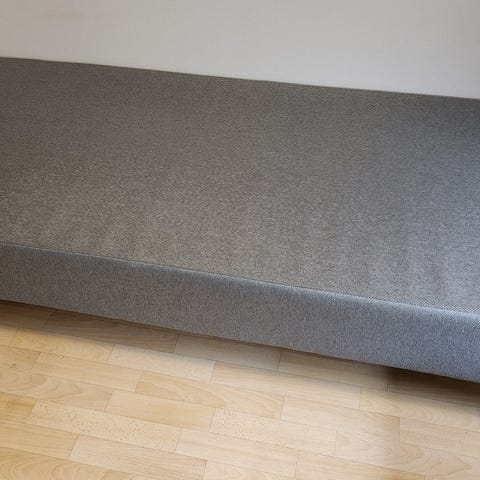 Perus runkopatjasänky, jalkojen kannakkeet sekä 20 cm korkuiset puiset jalat, sekä Wellpur petauspatja (tai ohuempi harmaa sijauspatja).