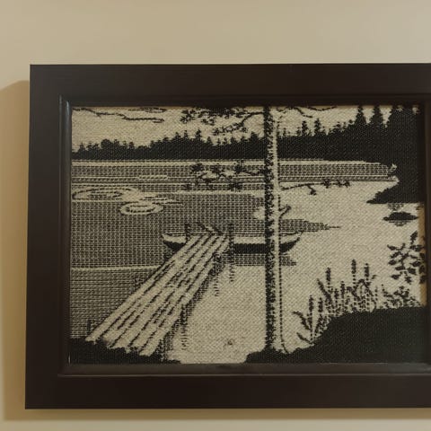 Mökki taulu Käsityönä valmistettu ristipistoilla