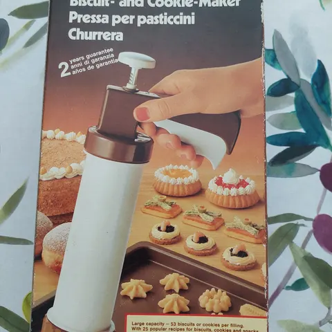 Pikkuleipä- ja koristepursotin. Voi tehdä erilaisia pikkuleipiä, tai pursottaa esim. kuohukermaa täytekakun päälle erilaisilla kuvioilla. 80-luvun alusta on tämä vempele, ja uudenveroisessa kunnossa. Nouto/postitus.