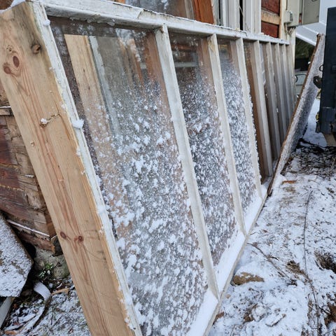 Ulko-ovesta purettu 80-luvun kaksilasinen lasiruutu alumiinikehyksellä.
