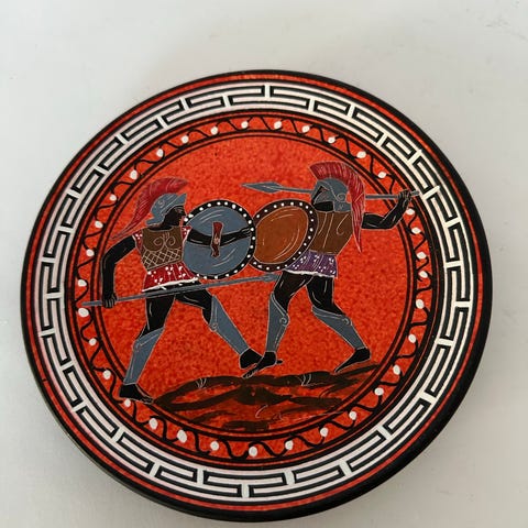 Pieni, kaunis, metallinen koristetaulu Kreikan mytologiasta. Hand made in Greece. Pyöreä, dia 29 cm. Pm. 8,90e.