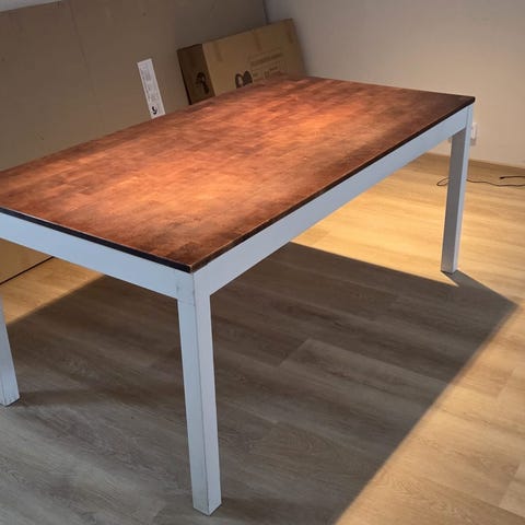 Hyvässä kunnossa oleva kuuden istuttava ruokapöytä.