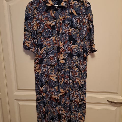 Ihana zizzin valkoinen mekko. Päällä rypytetty Kangas ja alla toinen valkoinen suoraa kangasta oleva alusmekko. Kauluksessa kauniita kukkia ja lehtiä. Koko zizzin L.