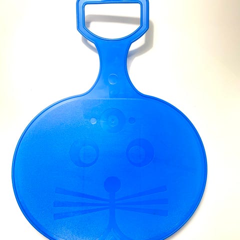 Kuva 2) Vesi-/lumiliukurin materiaali paksua muovia, reunoilla kaksi tukevaa kahvaa, liukuri on tarkoitettu vain yhdelle henkilölle kerrallaan,