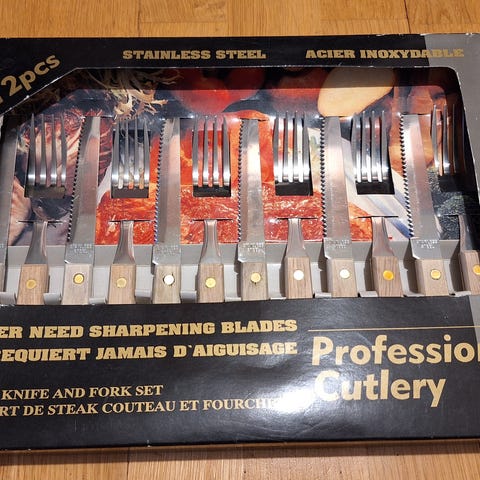 Siistissä laukussa olevat, ruostumattomasta teräksestä valmistetut aterimet. 6 haarukkaa 6 veistä ja massiivinen hakkuuveitsi. Aterimet ovat käyttämättömät. Hakusanat veitset, haarukat, keittiövälineet.
