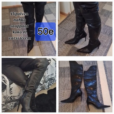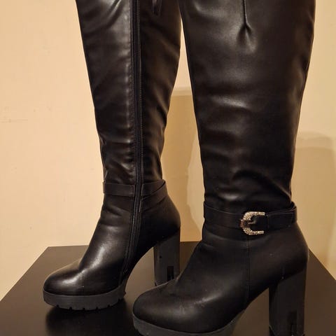 Ylipolvensaappaat / Reisisaappaat mustaa keinonahkaa. Merkki Pleaser, malli Vanity 3022ws. Edessä on nyöritys. Sisäsivulla vetoketju. Koko US 6 = EU 36. Uudet, vain sovitettu, eivät olleet sopivat.