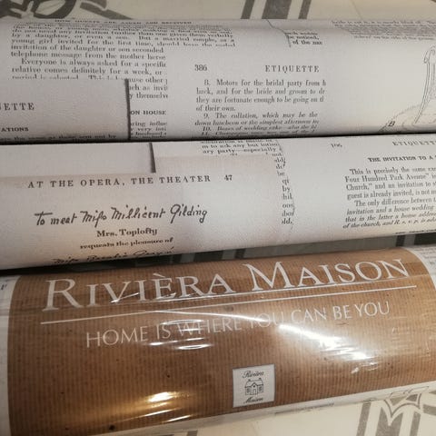 Myydään kaksi täyttä rullaa Riviera Maison tapettia plus yksi vajaa jossa on jäljellä reilusti yli puolet.