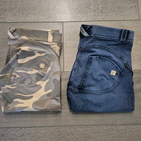 Maastokuvioiset Freddyt. Haaroissa langan purkauma. Ei näy käytössä.