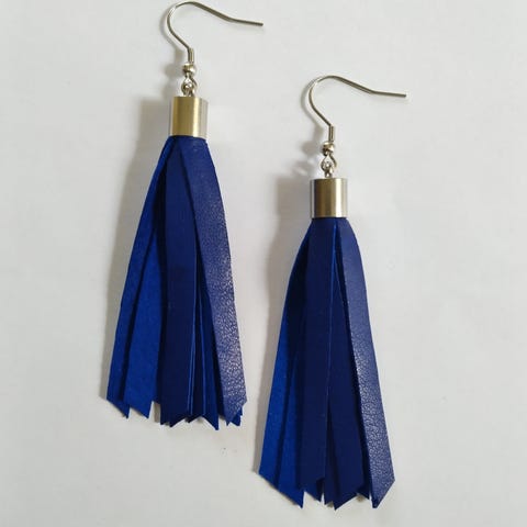 Käsityönä tehdyt korvikset upeeta keltaista nahkaa, kevyet, koukut kirurginterästä, pituus koukkuineen 8,5 cm.