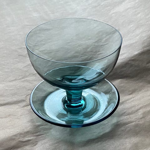 Erkki Vesannon Iittalalle mallinumerolla 2091 suunnittelemat kuulaan siniset Kimmo-jälkiruokamaljat. Tuotannossa 1938-1957.