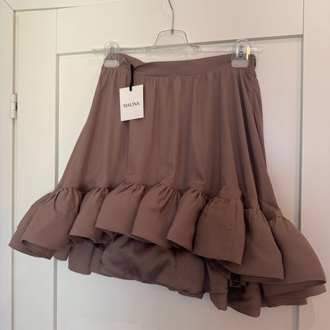 Hyväkuntoinen by Malene Birger hame. Materiaali polyester. Hameessa on vuori. Vyötäröllä kuminauhajoustin. Värit musta/oranssinkeltainen/harmahtavan luonnonvalkoinen. Koko 42.