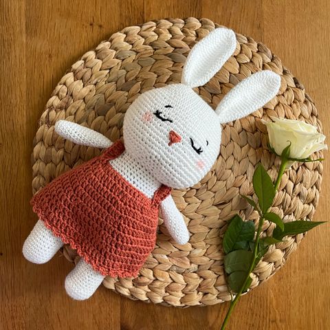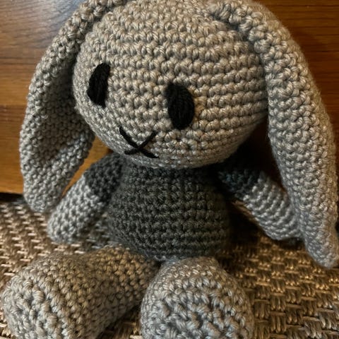 Myydään uusi, täysin suomalaisena käsityönä valmistettu virkattu pupu. Jänis, luppakorva on harmaa-valkoinen.