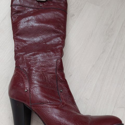 Espritin punertavanruskeat saappaat. Korko 8cm, varren pituus 30cm kantapäästä mitattuna. Pohkeen ympärysmitta n. 37 cm.