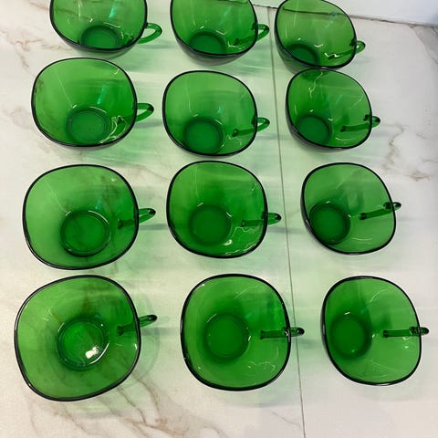 Myydään kuvan ehjät ja siistit lasiset Anchor Hocking vintage kahvikupit.
