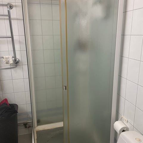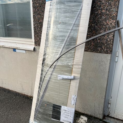 Uusi lasinen suihkunovi korkeus 161cm. leveys 53cm. Lasi on karkaistu ja vasara kuvioitu joka estää läpi näkyvyyden mutta antaa kuitenkin valoa. Soveltuu erittäin pieniinkin tiloihin
