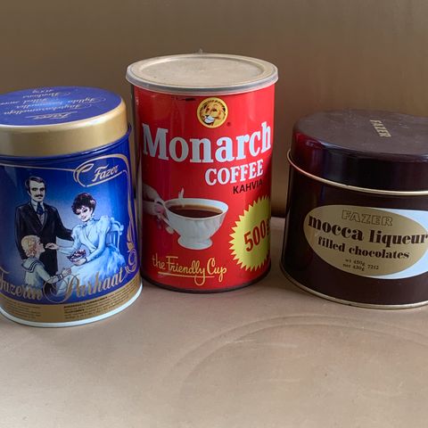 Myynnissä ikäisekseen erinomaisessa kunnossa olevat Fazerin vihreät kuulat-pahvirasiat. Molemmat yhteensä 8 eurolla.