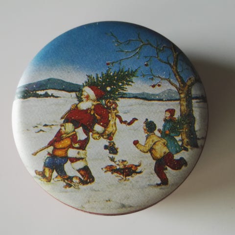 Jouluinen pyöreä peltirasia, halkaisija 16,5 cm, korkeus 7,5 cm. Reunassa teksti "Love is in the air... Christmas is in here". Siistikuntoinen.