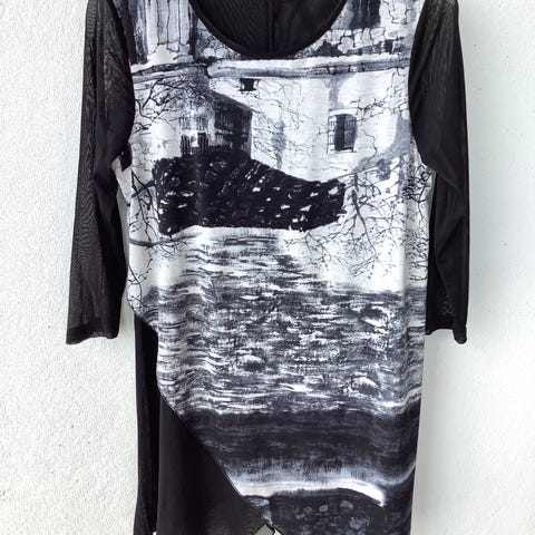 Hyväkuntoinen mekko, jossa kokomerkintä S, mutta menee mallin ja materiaalin joustavuuden johdosta mielestäni myös M kokoiselle: kai-kai 45 ja olka-helma 85 cm.