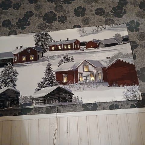 Taulu kaupunkimaisemalla, johon saa valot. Vaatii kolme paristoa, jotta valot saa päälle (ei kuulu kauppaan). Kyljessä on/off nappi.