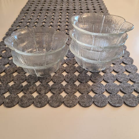 Lasinen iso kulho ja pienet jälkiruokakulhot