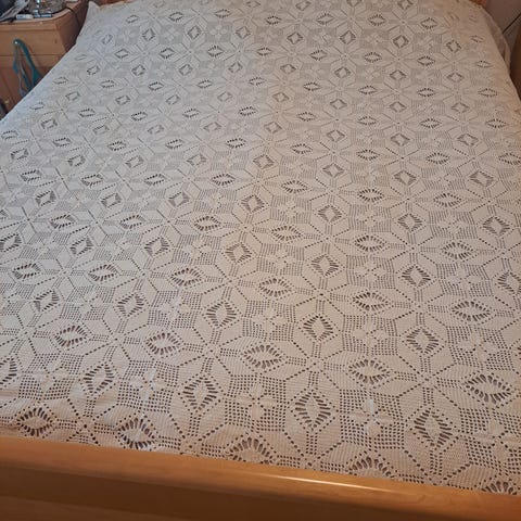 Virkattu päiväpeitto parisänkyyn. Ei ole käytetty kertaakaan. Peitteessä oli tahra ja se on poistettu. Voit tulla katsomaan ja joko hyväksyt sen tai hylkäät.🙂