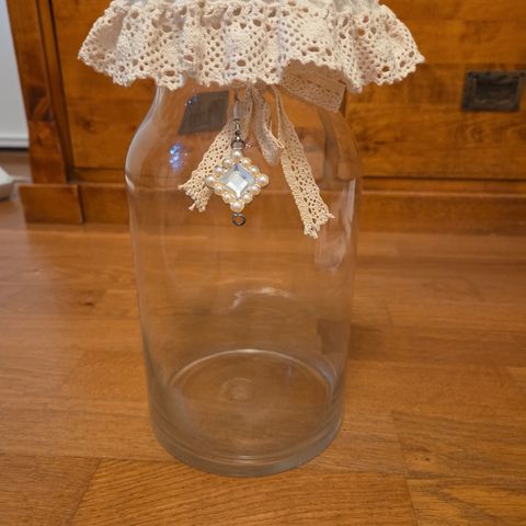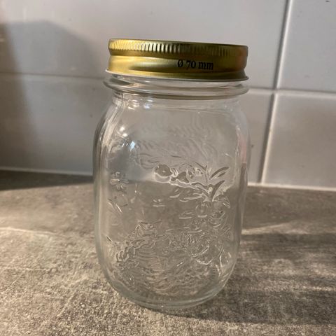 Lasipurkki, jonka korkeus 14 cm. Ei ilmatiivis. Purkissa säilytetty hajustettuja kuivakukkia.