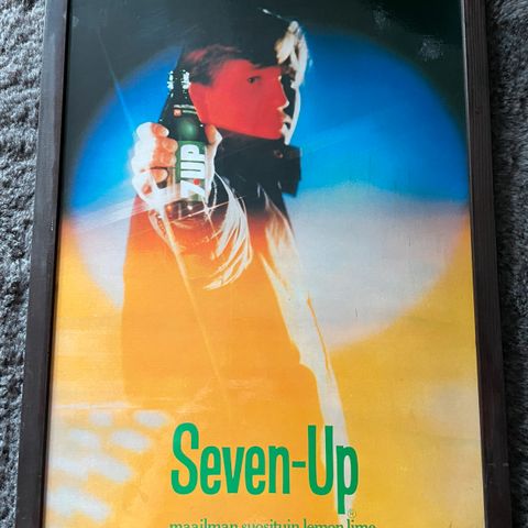 Vanha iso 7up limsapullo korkilla, 2,08 litraa. Ehjä. Korkeus 29cm ja halkaisija 12cm. Mitat noin mittoja.