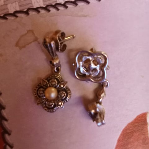 - kaksi erilaista: a) ruskeat puuhelmet, toisessa messinki koukku ja kaksi lenkkiä helmiä, b) toisessa 'lukittava' hopeanvärinen kiinnitys, ja yksi lenkki, 3eur/'hieman eripari' korvikset,