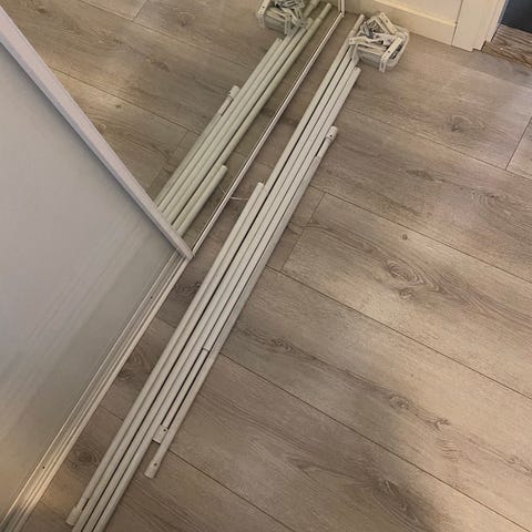Kaksivärinen verhokappa, koko rypistämättömänä 542x45cm. En ole varma materiaalista, mutta luulisin sen olevan puuvillaa. Rypytettynä ollut n. 340cm leveässä verhokiskossa. Saatu lahjaksi 2008-2009, ollut käytössä kevääseen 2023 asti. Hyvässä kunnossa.