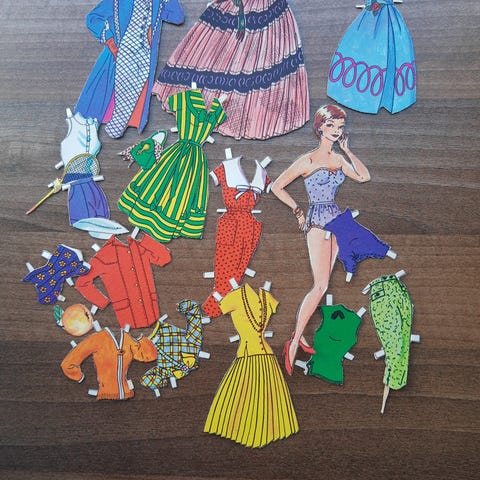 4) Kuvan 3 pahvinen nukke mallina + sopivat vaatteet 2eur/6kpl