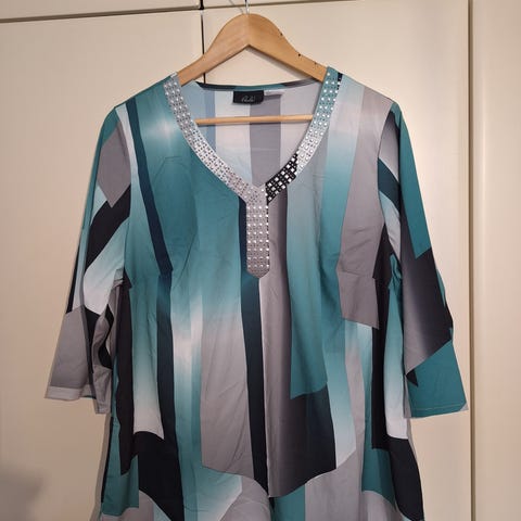 Uusi, turkoosi Marc Aurel-merkkinen hihaton paita. Paita kokonaan vuoritettu. Kumpikin, niin päällys, kuin vuorikin on hyvin joustavaa kangasta. Kaula-aukkoa kiertää pitsi ja edessä on pitsikoriste. Paitaa kiertää samettinauha, jossa edessä on paljetteja. Paita on muotoiltu edessä ja takana kulkevilla pystysaumoilla hiukan vartaloa myötäileväksi.