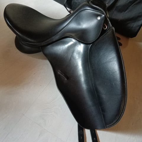 Myydään Thorowgood koulusatula (17 ") vaihtookaarilla, nyt tarpeettomana. Vähällä käytöllä ollut, hieno ja siistikuntoinen. Ompeleet kaikki ehjät, ja nahkaleikkaukset "uudenkarheat". Penkin pituus ylhäältä mitattuna reilu 16", ja sivusuunnasta pitkittäin mitattuna 18". Viime ajat vain säilytelty. Satulassa nyt sisällä leveä XL-vaihtokaari. Käytetty viimeksi suht leveäselkäisellä ja matalasäkäisellä lv-hevosella. Satula on Kotka/Hamina alueelta noudettavissa.