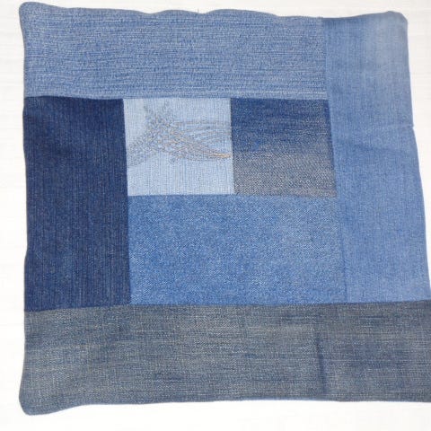 Farkkukankaasta tehty "lokerikko" , joissa erikokoisia taskuja, joihin voi laittaa tavaroita säilytykseen