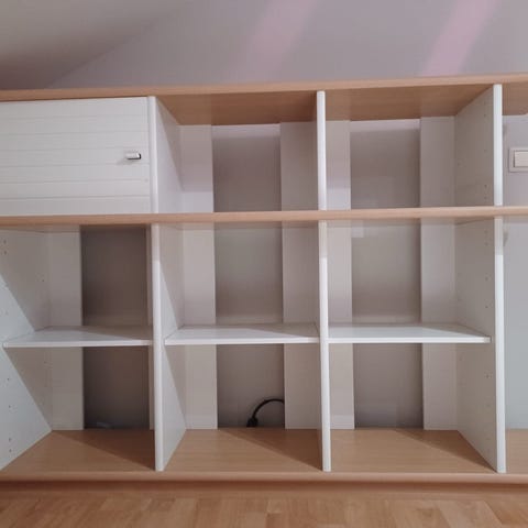 Muutossa yksi kokonainen väliosa tätä kuvassa näkyvää hyllyä jäi tarpeettomaksi kun ei mahtunutkaan enää kokoleveydessään nykyiseen kotiimme.